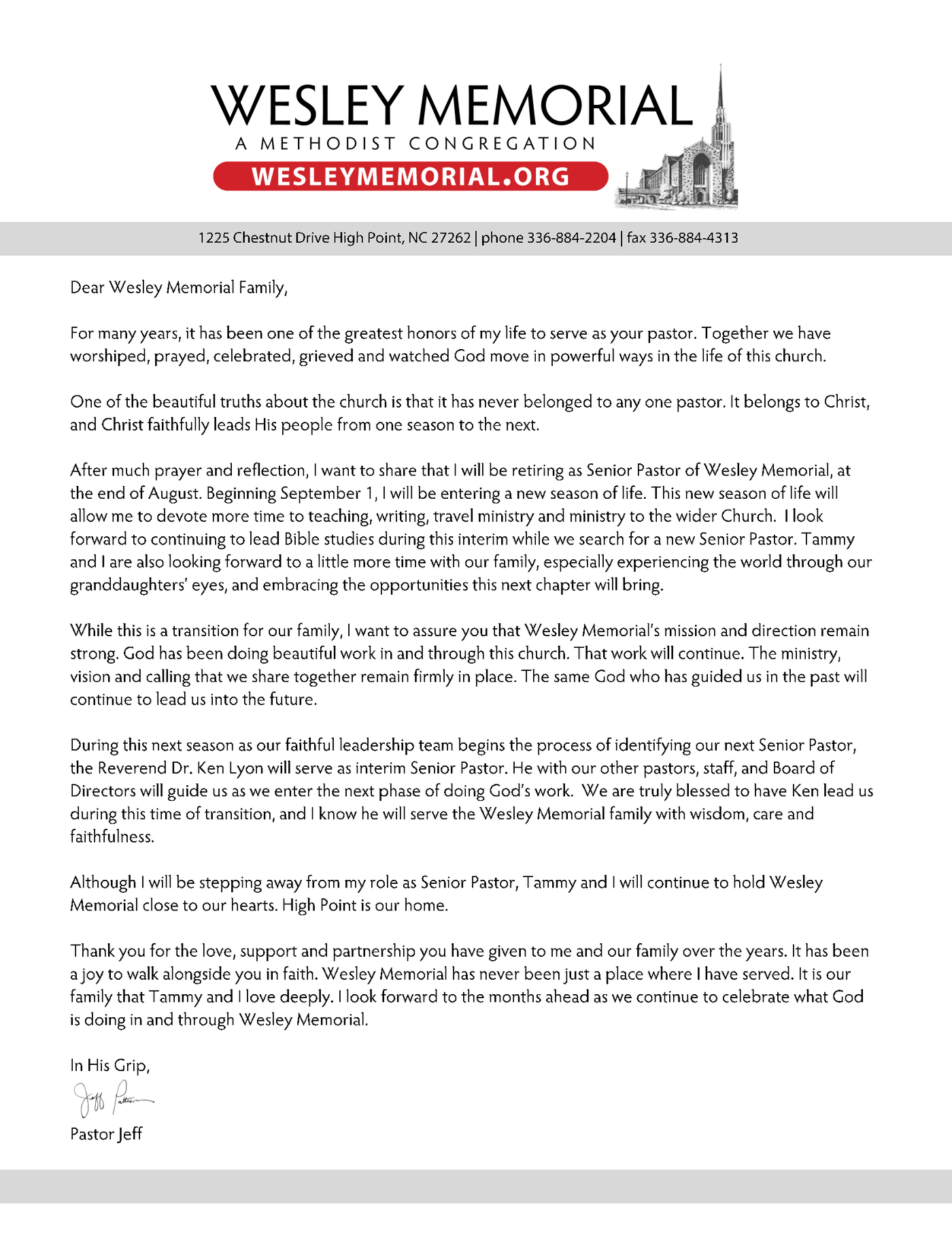 Wesley Memorial family, as our church enters an important season of transition, we are committed to approaching the process with prayer, wisdom, and intentionality. Please know that your SPRC and pastoral search team are already at work to serve these goals! Guided by proven work on pastoral transitions, our leadership is taking thoughtful steps to ensure a healthy, thorough, and spirit-lead search for our next Senior Pastor.